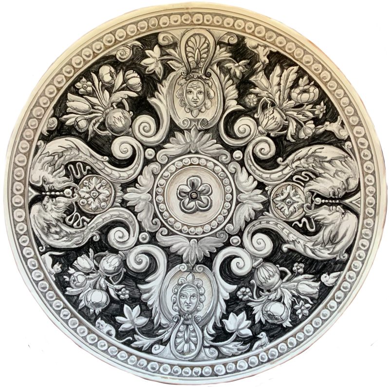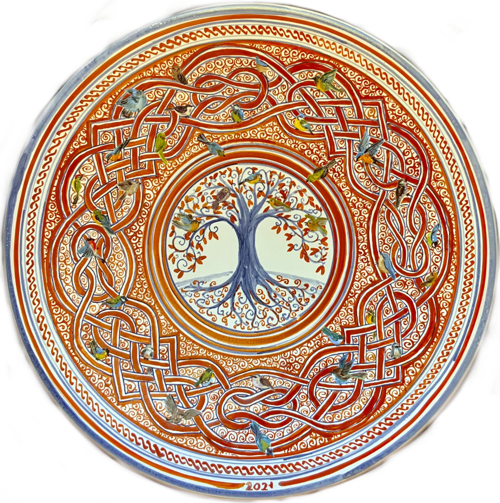 Strom života podruhé. Významů se mu přisuzuje mnoho, ale mě je nejbližší jako symbol propojení. Takže tu propojuji keltské motivy s majolikou typu „a ricamo“ –„výšivkou“ z konce 16. století, který se často používal v italském městě Faenza.