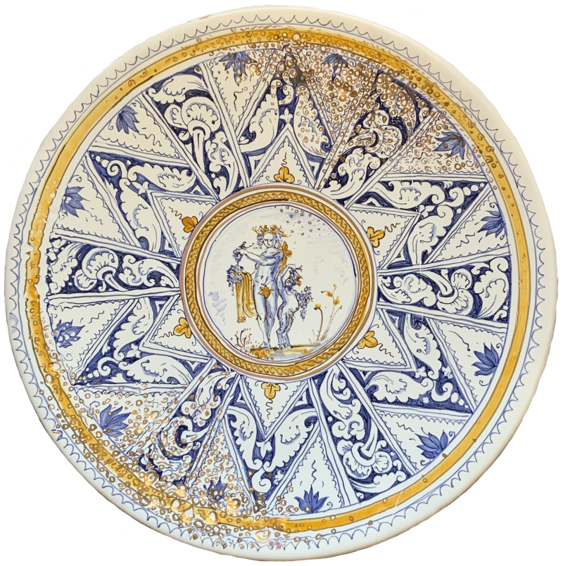 Šampaňské prý vzniklo omylem. Tenhle talíř vlastně taky, vrstva glazury byla příliš silná a udělaly se v ní bublinky. Rozhodla jsem se je ozdobit zlatem, protože naše nedokonalosti nás činí jedinečnými a nám tedy nezbývá nic jiného než je přijmout nebo pracovat na jejich zlepšení. Postavy uprostřed jsou Bakchus a Satyr, motiv na obvodu vychází ze vzoru na talíři v muzeu v italské Faenze, která dala jméno fajánsi.