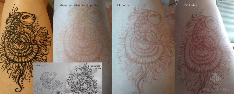 - Obrázek bude zprvu světlý - oranžový, plně se vybarví během následujících 48 hodin. V této době omezte kontakt s vodou, před sprchou doporučuji místo potřít olejem.